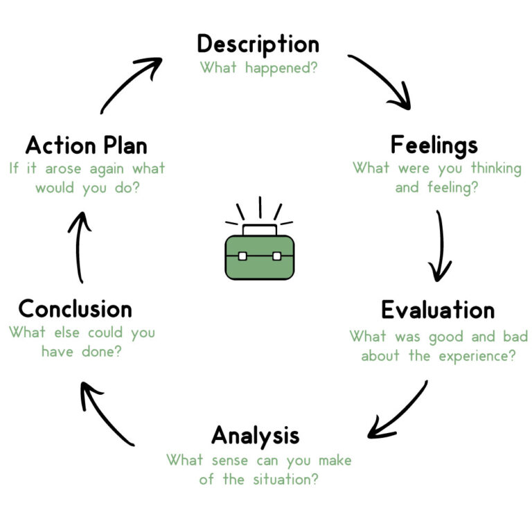 Att få feedback är viktigt både för studeranden och för den som coachar. Det är viktigt att båda reflekterar över vad de har hört och kommer överens om hur de ska använda det. Gibbs reflektionscykel uppmuntrar dig att tänka systematiskt på faserna i en erfarenhet eller aktivitet, du bör använda alla steg för att strukturera din reflektion. De sex stegen i Gibbs reflektionscykel är: